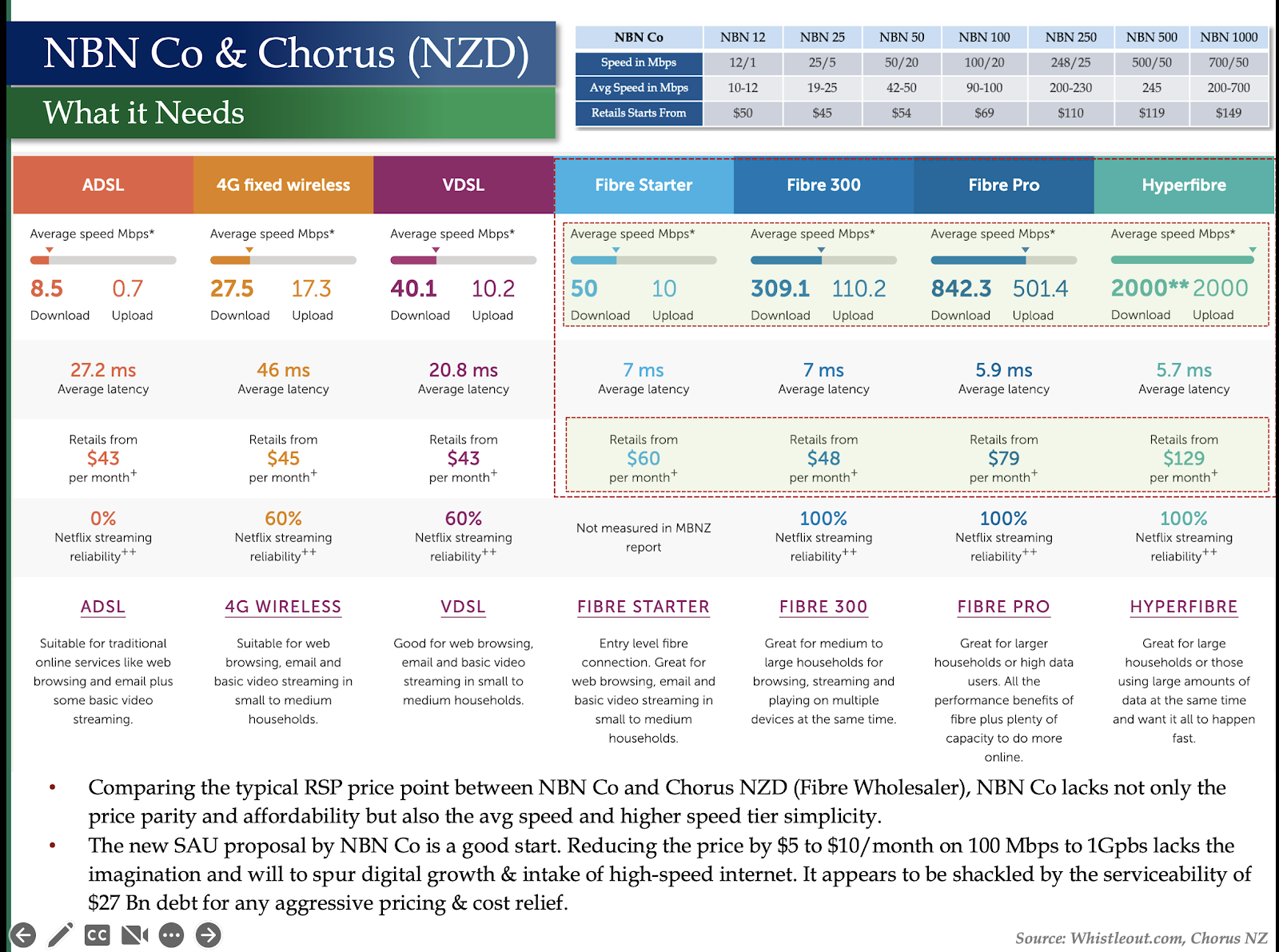 - Comparing the typical RSP price point between NBN Co and Chorus NZD (Fibre Wholesaler), NBN Co lacks not only price parity and affordability but also the avg speed and higher speed tier simplicity.